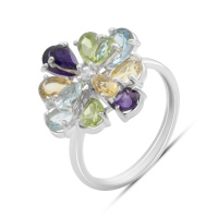 Родированное серебряное кольцо 925 пробы с натуральным аметистом 3.558ct, цитрином, хризолітом, топазом. Родированные украшения дольше сохраняют...