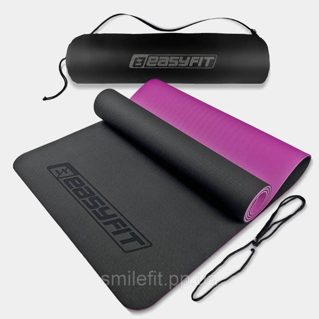 Килимок для йоги та фітнеса EasyFit TPE+TC 6мм двошаровий + Чохол чорний з фіолетовим