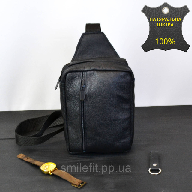Сумка чоловіча - шкіряна, нагрудна сумка слінг шкіряна чорна на 3 кишені, чоловіча сумка на груди