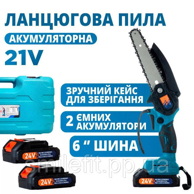 Акумуляторна ланцюгова міні пила 6« (15 см) Domotec 24V для обрізання дерев та розпилу дров, по дереву