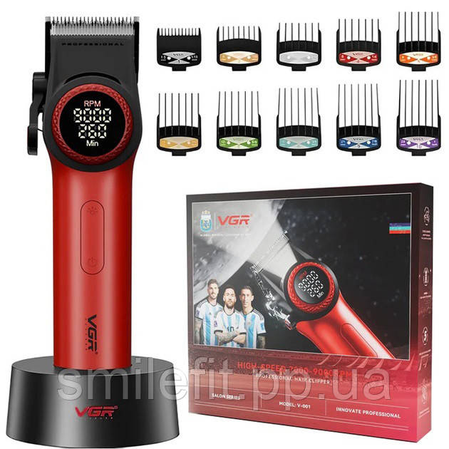 Професійна машинка для стрижки волосся VGR V-001 RED з дисплеєм 9000 об та 10 насадками (1,5-24 мм)