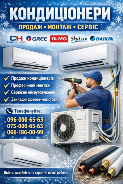 Продаж встановлення, заправка, ремонт, обслуговування кондиціонерів Київ та область !Пропонуємо великий асортимент сучасних економних кондиціонерів провідних світових виробників.Досвід та професіоналізм наших майстрів допоможуть вам швидко та якісно виконати будь-які замовлення по монтажу спліт-системи у стислі терміни.Ми професійно проконсультуємо та запропонуємо найоптимальніший варіант. Наші кваліфіковані фахівці швидко та якісно проведуть монтаж.Вам залишиться тільки насолоджуватись комфортом у спеку чи холод.Ціни на монтаж систем кондиціонування залежать від складності проведення робіт, тому ціни у нас договірні, проте завжди доступні.Крім того, якщо Ви замовляєте кондиціонер у нас, то Ви отримуєте знижку на його монтаж.Якісне встановлення кондиціонерів відбувається протягом двох трьох годин.Для професіоналів це під силу, тому нашою роботою Ви будете задоволені. Ми забезпечуємоякісним обладнанням та його установкою сотні людей, при чому недорого і оперативно.Надаємо гарантію 24 міс на монтажні послуги з моменту встановлення кондиціонераВи можете не тільки купити кондиціонер, але також замовити встановлення кондиціонера. Вам не доведеться шукати майстрів зі встановлення -наші спеціалісти допоможуть Вам обрати кондиціонер, правильно підібрати місце для його монтажу, а також швидко та якісно встановити кондиціонер.Використовуємо якісні європейські матеріали (не Китай).Гарантійне та після гарантійне обслуговування спліт-систем.Пропонуємо максимально топових виробників по найкращим цінам: Cooper&Hunter, Olmo, Leberg, Midea, AUX, Tosot, TKS, GREE, Osaka, Neoclima, Mitsubishi, Galactic, Daikin та інші виробники. Ви можете придбати кондиціонер та оформити умови монтажу, при необхідності наш представник може на місці оцінити складність, особливості та вартістьнастановних робіт. У нашій практиці так само поширена послуга, коли монтаж проводиться в кілька етапів, а саме - коли монтаж фреонової трасипровадиться на початку ремонтних робіт, а встановлення кондиціонера проводиться після чистового оздоблення.Ви можете розраховувати на якісну установку та сервіс на весь період експлуатації замовленого у нас обладнання.Ми виконуємо повний цикл робіт, від технічної пропозиції до продажу та встановлення кондиціонера.Продаж та монтаж кондиціонерів ведеться силами професійних інженерів, монтажних бригад, які укомплектовані всім необхідним проф.і є штатними, що гарантує відповідальний підхід, високу якість та надійність.Інженери нашої компанії в будь-який зручний для Вас час зможуть дати консультацію щодо кондиціонерів безпосередньо на об'єкті, запропонуютьсвої рекомендації та допоможуть у виборі того чи іншого кондиціонера.Усі кондиціонери та інша продукція сертифіковані, мають сертифікати якості, забезпечуютьсягарантійним та післягарантійним обслуговуванням.При монтажі кондиціонера ми використовуємо лише сертифікований та якісний витратний матеріал.Якщо Ви вирішили купити та встановити кондиціонер, ми виконаємо Ваше замовлення у мінімальні терміни та у зручний для Вас час.Також для Вашої зручності Ви можете купити та встановити кондиціонер не тільки у будні, а й у вихідні та святкові дні.Гнучка цінова політика дозволяє працювати з усіма суб'єктами ринку, починаючи від приватних осіб і закінчуючи державними підприємствами.Ми прагнемо бути н