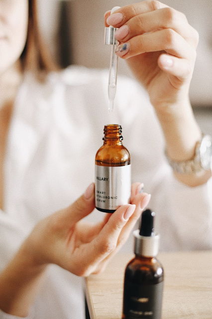 3. Промокніть очищене обличчя м'яким рушником і нанесіть трохи гіалуронової сироватки. Так молекули гіалурону отримають достатню кількість вологи для роботи в верхніх шарах шкіри.
