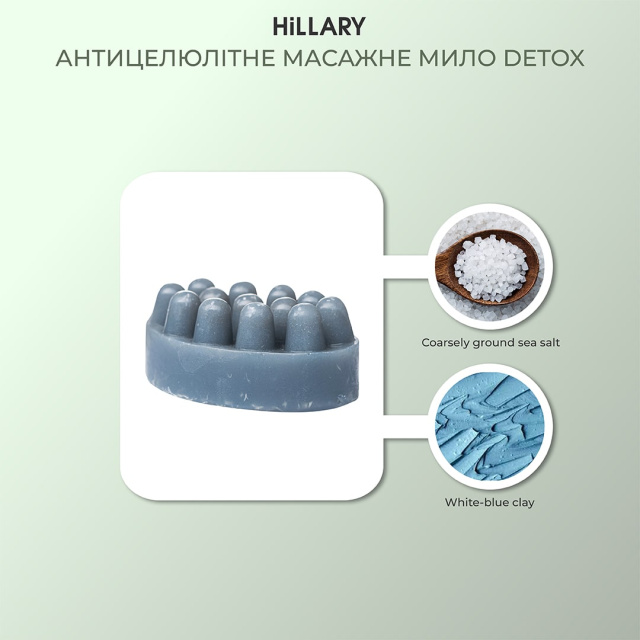 Антицелюлітне масажне Detox мило Hillary допомагає боротися з целюлітом та позбавить вашу шкіру від токсинів, не пересушуючи та залишаючи її свіжою. Біло-блакитна глина у складі містить корисні мінеральні речовини, які сприяють регенерації шкіри. Морська сіль знімає ороговілі клітини зовнішнього шару шкіри. Масажна дія збільшить циркуляцію крові та лімфи, забезпечить подачу необхідних мікроелементів, вітамінів, органічних кислот і антиоксидантів через шкіру.