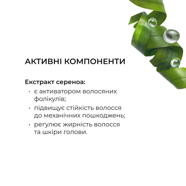 Екстракт карликової пальми сереноа є активатором волосяних фолікулів, що стимулює ріст волосся. Він робить волосся слухняним і легким у розчісуванні, підвищує його стійкість до механічних пошкоджень і регулює жирність волосся та шкіри голови, забезпечуючи здоровий баланс. Ваше волосся виглядає живим і доглянутим.