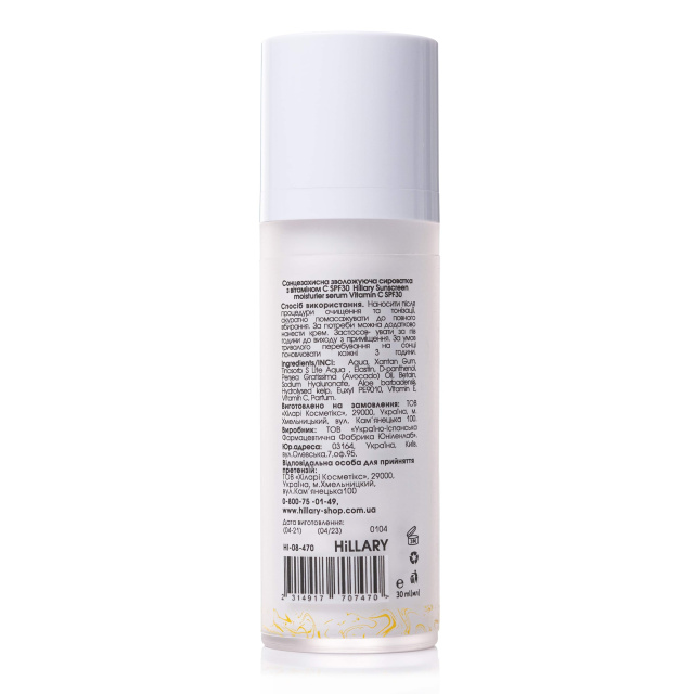Сонцезахисна зволожуюча сироватка з вітаміном С SPF30 Hillary Sunscreen moisturier serum Vitamin C SPF30, 30 мл, Київ