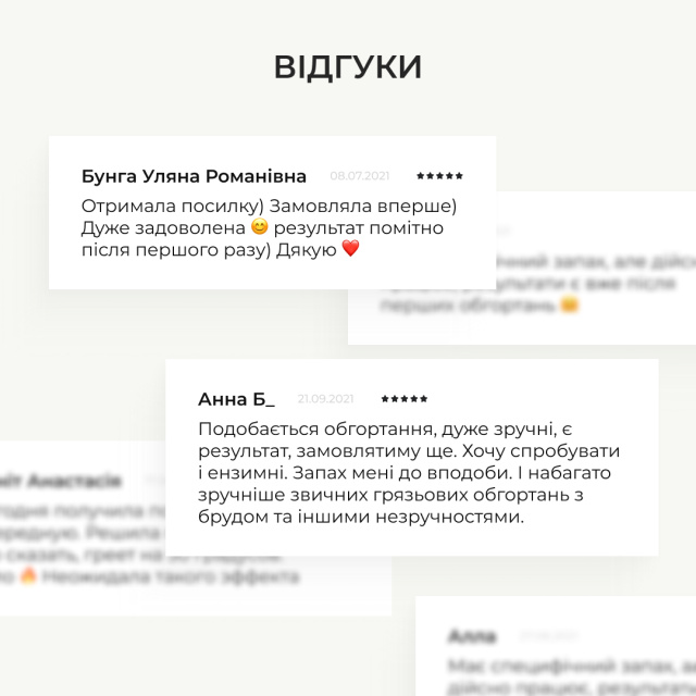 Обгортання стануть у нагоді для тих, хто бажає зменшити прояви целюліту та розтяжок, прагнуть покращити еластичність та пружність шкіри та шукає ефективні засоби для детоксикації та лімфодренажу.