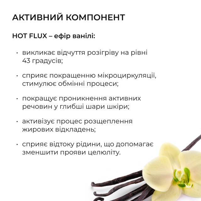 HOT FLUX (зігрівальний компонент) - це ефір ванілі, отриманий унікальним способом. Саме ефір ванілі, надаючи помірно подразнюючу дію на нервові рецептори, викликає відчуття розігріву на рівні 43 градусів. Вплив на епідермальні кератиноцити, клітини Лангерганса, потові залози і гладкі клітини також підвищує імунний статус і стимулює регенеративні процеси в шкірі.