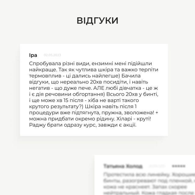 Антицелюлітні ензимні обгортання пригнічують розростання жирової тканини, розщеплюють наявні надмірні жирові відкладення, фіброзні спайки, знімають набряки у тканинах, уражених целюлітом.