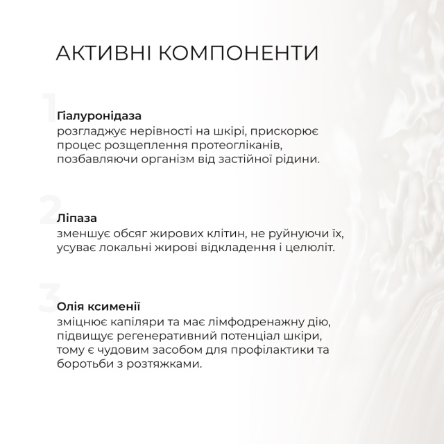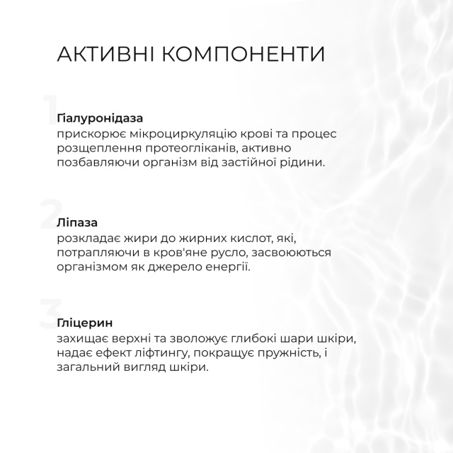 Гель-концентрат з ензимним комплексом, направленим на корекцію контурів тіла та зменшення жирових відкладень, уповільнює ріст жирових клітин, покращує тонус і пружність шкіри, прискорює процес спалювання жирових відкладень.