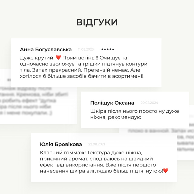 Гоммаж з кремовою текстурою та очеретяними волокнами м’яко та глибоко очищує шкіру проблемних ділянок, надаючи масажний ефект та сприяючи кращій антицелюлітній дії активних компонентів.