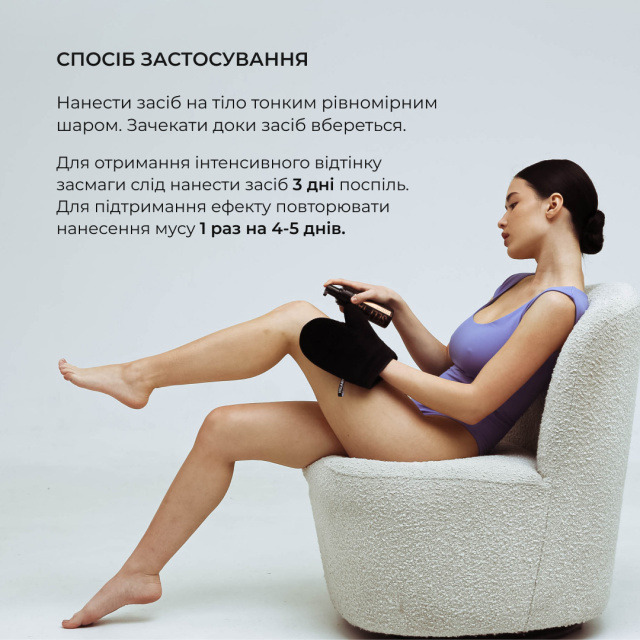 Для отримання інтенсивного відтінку засмаги достатньо наносити засіб 3 дні поспіль. Для підтримання ефекту повторювати нанесення мусу 1 раз на 4-5 днів.