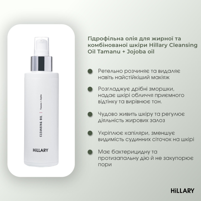 Гідрофільна олія для жирної та комбінованої шкіри Hillary Cleansing Oil Tamanu + Jojoba oi створена на основі інноваційних емульгаторів рослинного походження, чудово підходить для щоденного очищення шкіри, має себорегулюючі властивості та не забиває пори, не викликає запалення, не шкодить мікробіому та зберігає природний Ph-баланс шкіри, ретельно розчиняє та видаляє навіть найстійкіший макіяж, добре змивається та чудово підходить для масажу обличчя, розгладжує дрібні зморшки, надає шкірі обличчя приємного відтінку та вирівнює тон.