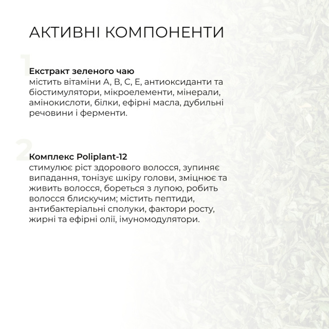 Шампунь спеціально розроблений для шкіри голови із надмірною секрецією шкірного сала па позбавленого об’єму волосся. Очищає та регулює жирність шкіри, протидіє ефекту жирного волосся. Завдяки вмісту органічного екстракту зеленого чаю стимулює волосяні цибулини та живить їх, має антибактеріальну дію, усуває жирність волосся і дарує йому неймовірний блиск та довготривалий об’єм.