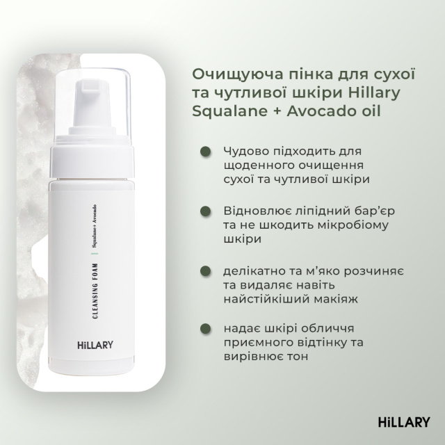 - Очищуюча пінка для сухої та чутливої шкіри Hillary Cleansing Foam Squalane + Avocado oil, 150 мл;
