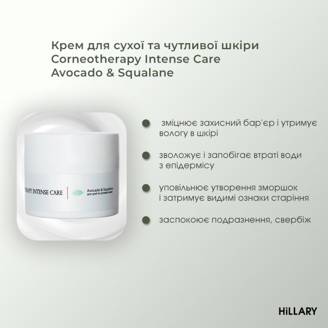 - Крем для сухої та чутливої шкіри Hillary Corneotherapy Intense Сare Avocado & Squalane, 50 мл.