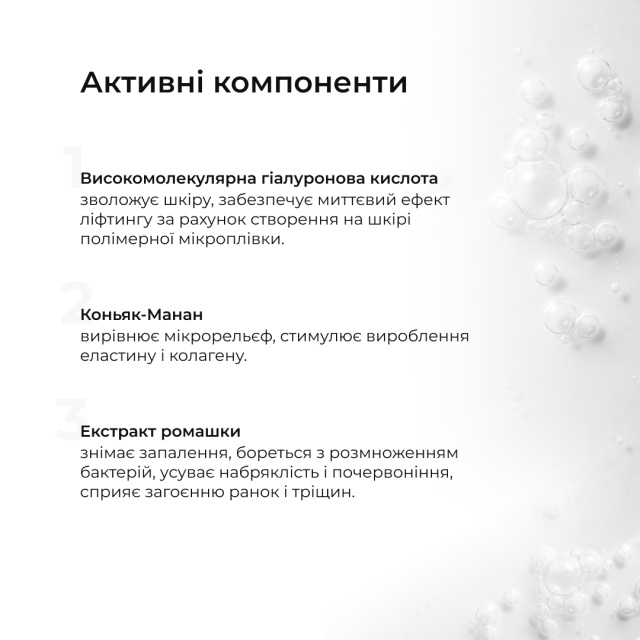 - забезпечує миттєвий ефект ліфтингу за рахунок створення на шкірі полімерної мікроплівки.