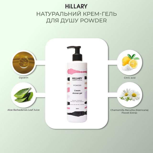 - Натуральний крем-гель для душу Hillary POWDER Cream Shower Gel, 500 мл;