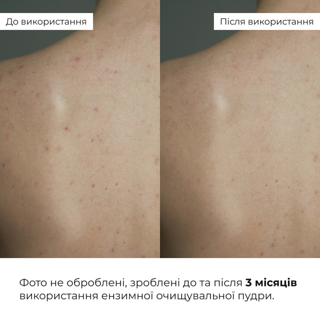 Ензимна пудра чудово підходить для боротьби з акне на тілі, зокрема на спині та сідницях, оскільки ефективно розщеплює жир і видаляє мертві клітини та сприяє очищенню шкіри від забруднень і надлишку себуму. Пребіотик BIOLIN P відновлює баланс мікробіому шкіри, зменшуючи ризик висипань і подразнень. Регулярне використання ензимної пудри для очищення шкіри тіла запобігає виникненню нових висипань.