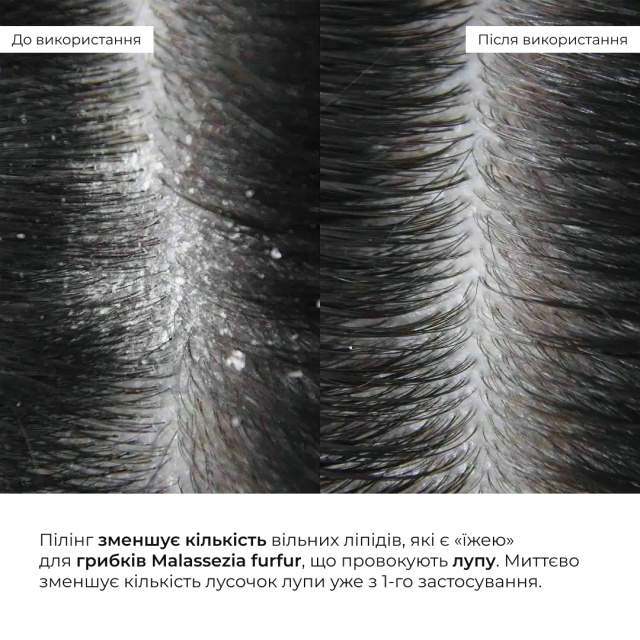 Пілінг зменшує кількість вільних ліпідів, які є «їжею» для грибків Malassezia furfur, що провокують лупу. Миттєво зменшує кількість лусочок лупи уже з 1-го застосування.