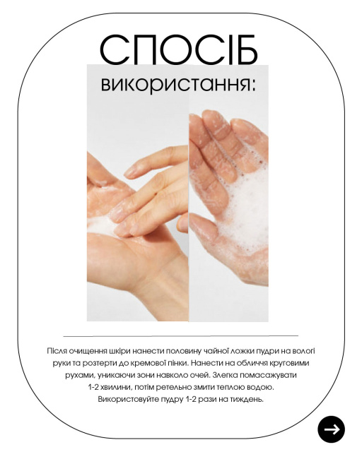 Ензимна пудра для ефективного очищення та вирівнювання рельєфу шкіри. Містить 2 типи ензимів рослинного походження - PROTEASE та LIPASE. Вони розчиняють надлишкові ліпіди, які продукують сальні залози, та ороговілі клітини, не зачіпаючи при цьому здоровий шар епідермісу.