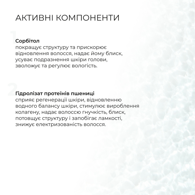 Кондиціонер зміцнює, зволожує та полегшує розчісування волосся, живить і потовщує тонкі пасма, не обтяжуючи волосся.
