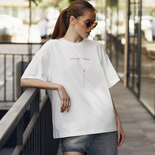 Футболка one size ідеально підійде для створення повсякденних образів. Виготовлена з високоякісної легкої бавовняної тканини, біла лаконічна футболка з актуальним мінімалістичним написом стане улюбленою річчю цього літа! Стильна силіконова прозора бірка на спинці стане родзинкою, що підкреслить індивідуальність.