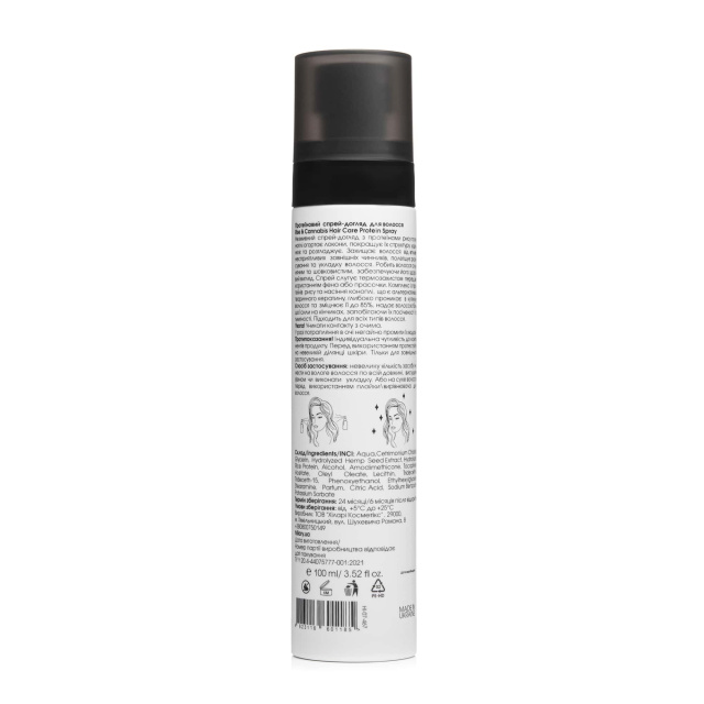 Незмивний спрей-догляд з протеїнами рису та коноплі огортає локони, покращує їх структуру, ущільнює та розгладжує. Захищає волосся від впливу несприятливих зовнішніх чинників, полегшує розчісування та укладку волосся.