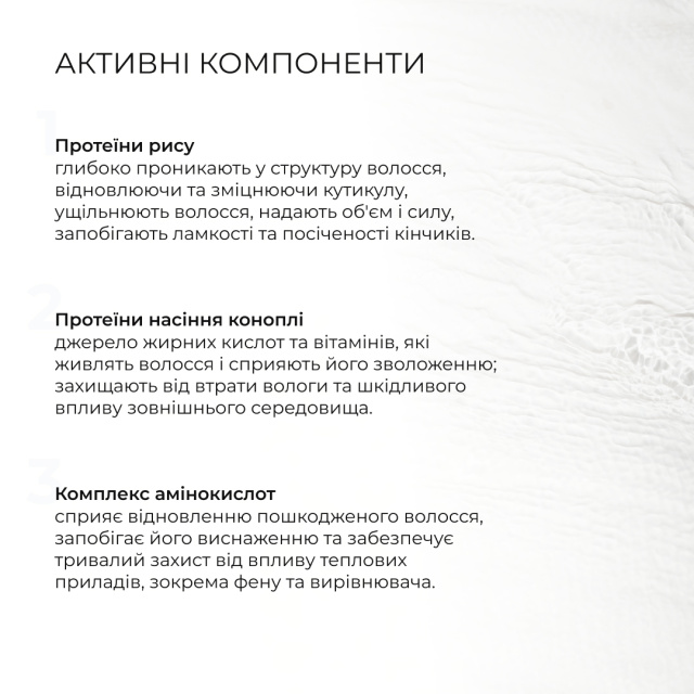 Амінокислоти сприяють відновленню пошкодженого волосся, запобігають його виснаженню та забезпечують тривалий захист від впливу теплових приладів, таких як фени та прасочки.