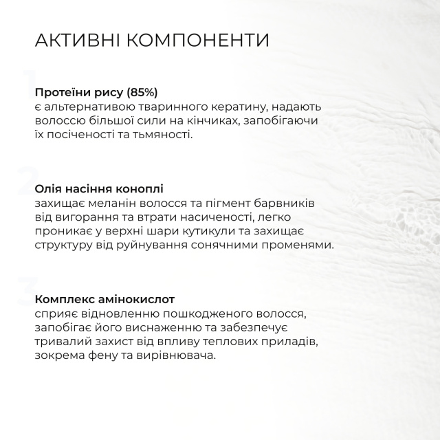 Hillary Rise & Cannabis Hair Care Protein Spray з протеїнами рису та коноплі покращує структуру волосся, ущільнює та розгладжує локони, полегшує розчісування та захищає від термічних ушкоджень. Ідеальний вибір для захисту та живлення волосся, схильного до посіченості та ламкості.