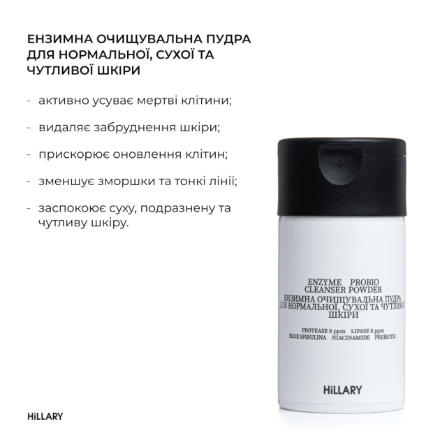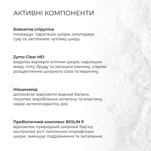 Ензимна пудра дбайливо очищає шкіру, видаляючи відмерлі клітини та покращуючи її мікробіом. Пудра на основі блакитної спіруліни і пребіотичного комплексу залишить вашу шкіру свіжою, гладенькою та сяючою.