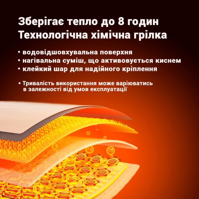 Зніміть захисну плівку та прикладіть клейкий бік грілки до одягу тієї частини тіла, яку бажаєте зігріти. Грілка буде давати тепло вже через 5 хвилин після відкриття.