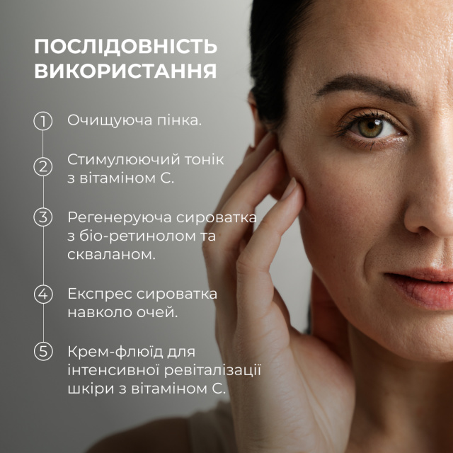 Сироватка з біо-ретинолом стимулює процеси відновлення клітин, зменшує глибину зморшок та покращує текстуру шкіри, роблячи її більш гладкою і пружною, а сироватка навколо очей ефективно усуває набряки та темні кола, надаючи шкірі свіжий вигляд. Завершує ритуал крем-флюїд, який живить та покращує еластичність, запобігаючи появі нових ознак старіння.