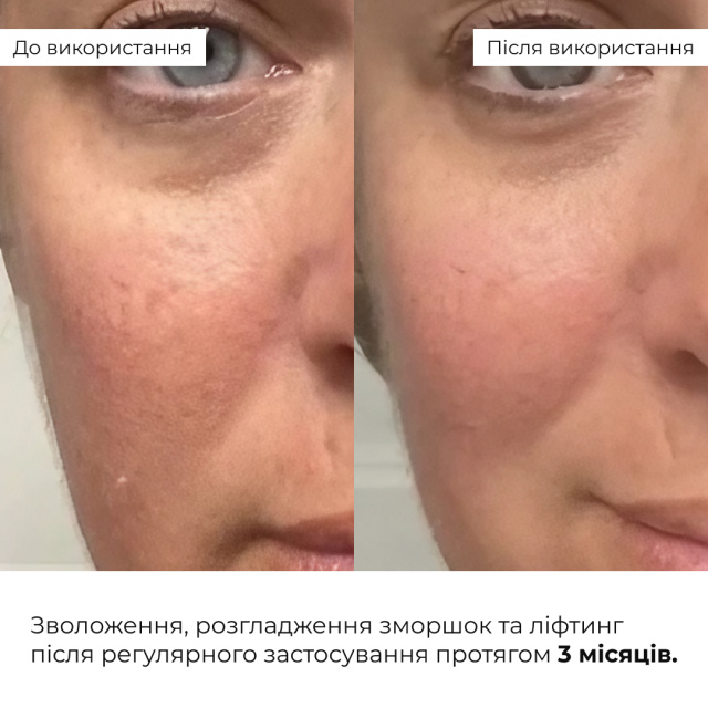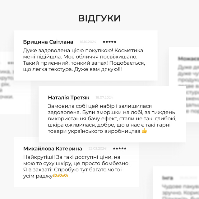 Після 4 тижнів використання набору значно покращився стан шкіри. Пружність шкіри збільшилась на 35%, що свідчить про значне зміцнення її структури. Дрібні зморшки зменшились на 30%, що додає шкірі гладкості та молодшого вигляду. Пігментація знизилась на 25%, вирівнюючи тон шкіри і надаючи їй здорового вигляду. Покращення рівня зволоженості склало 50%.