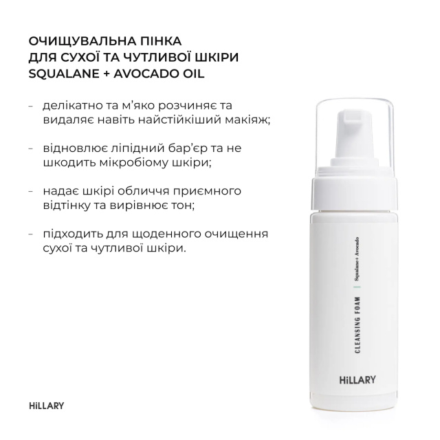 - Очищуюча пінка для сухої та чутливої шкіри Hillary Cleansing Foam Squalane + Avocado oil, 150 мл