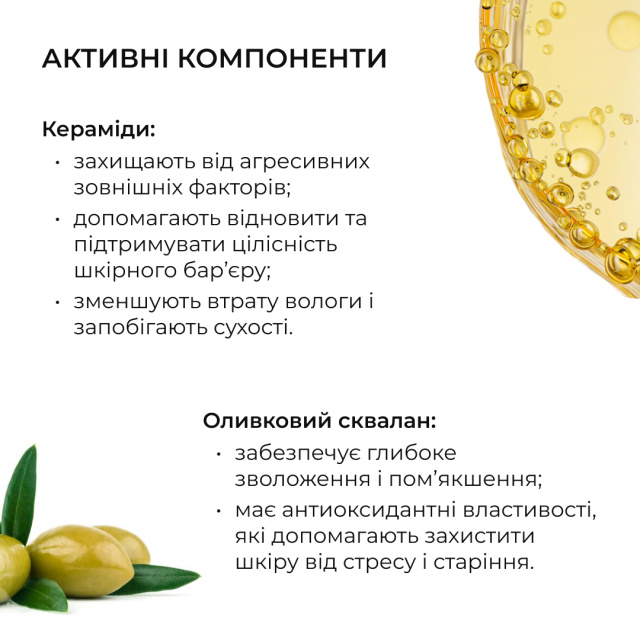 Завдяки унікальній комбінації рослинних керамідів та оливкового сквалану, забезпечує високоефективне зволоження, запобігає старінню, допомагає захистити шкірний бар’єр від зовнішнього щоденного стресу.