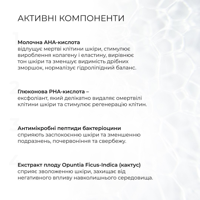 Кислотний тонік-пілінг з молочною AHA-кислотою сприяє ексфоліації поверхні шкіри, вирівнює її та надає сяйва. Стимулює оновлення клітин шляхом активації природних механізмів захисту та регенерації шкіри.