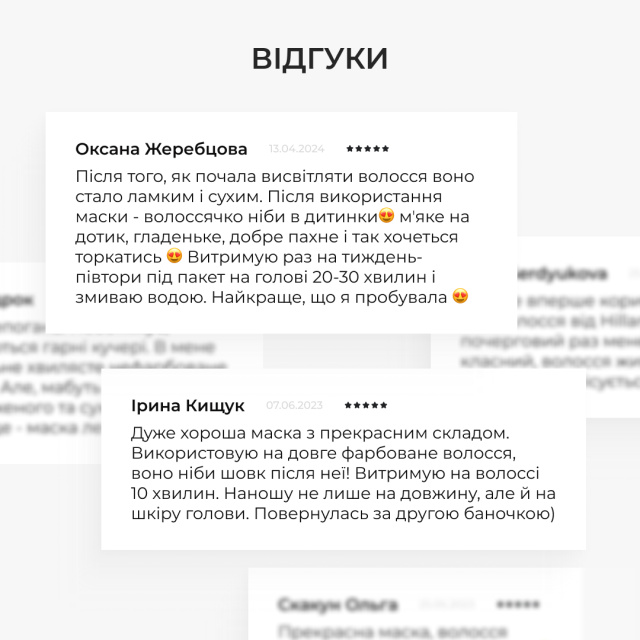 Маска підходить для будь-якого типу волосся та забезпечує інтенсивне відновлення по всій довжині. Формула на основі ізофлавонів бамбука, протеїнів пшениці та лецитину працює на глибокому рівні, зміцнюючи волосся природним шляхом. Маска зволожує, згладжує, додає блиску й не обтяжує, залишаючи волосся м’яким і доглянутим. Не містить SLS, силіконів і парабенів.