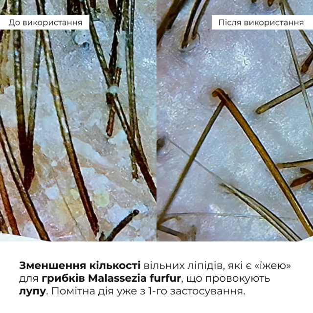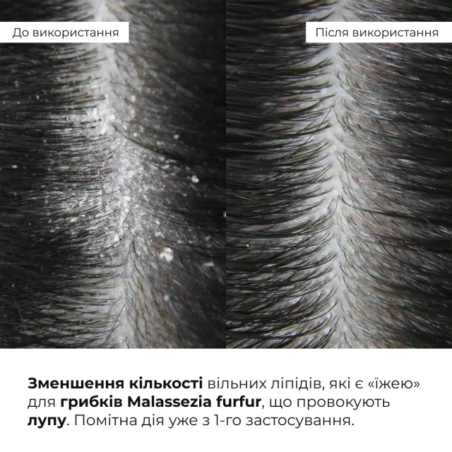 Пілінг зменшує кількість вільних ліпідів, які є «їжею» для грибків Malassezia furfur, що провокують лупу. Миттєво зменшує кількість лусочок лупи уже з 1-го застосування.