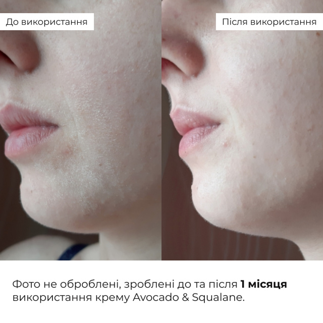 Сквалан – пом’якшує шкіру, укріплює захисний бар’єр, утримує вологу, розгладжує зморшки та підвищує еластичність. Олія авокадо – зволожує, запобігає втраті води, зміцнює судини, регулює гідроліпідний баланс, заспокоює подразнення та стимулює клітинний метаболізм.
