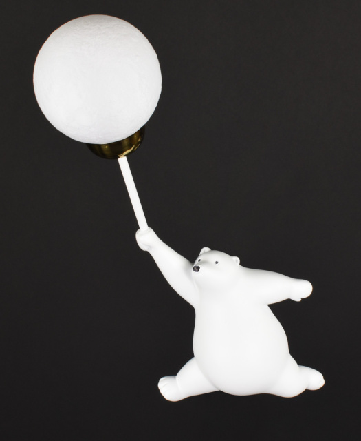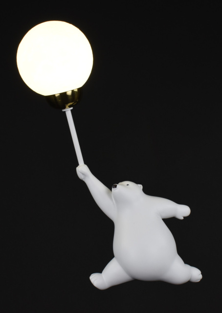 Бра в виде медвежонка, держащего шарик-плафон, фигура мишки изготовлена из гипса, плафон расположен с левой стороны, размеры 20х37 см, отступ от стены 10 см, патрон G9, плафон диаметром 10 см.