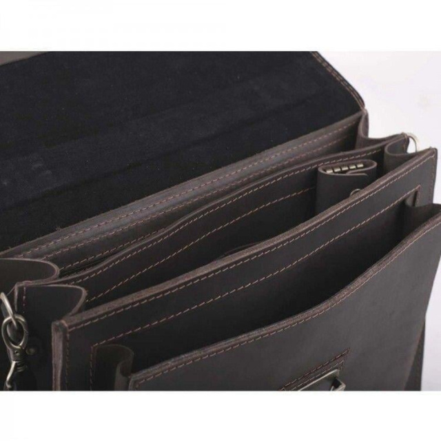- Два відділення формату А4, внутрішнє оздоблення — текстиль і замша.Під клапаном додаткова кишеня. Слоти для письмових ручок і карток