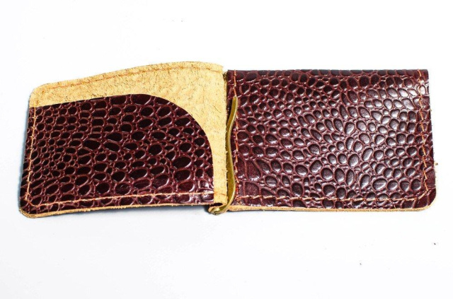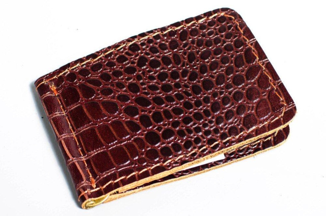 Стильний респектабельний якісний коричневий затискач для грошей, купюр із кишенею на кнопці з натуральної шкіри ТЕЛЯЧОЇ шкіри з тисненням фактура шкіра крокодила.