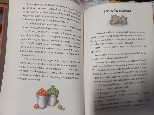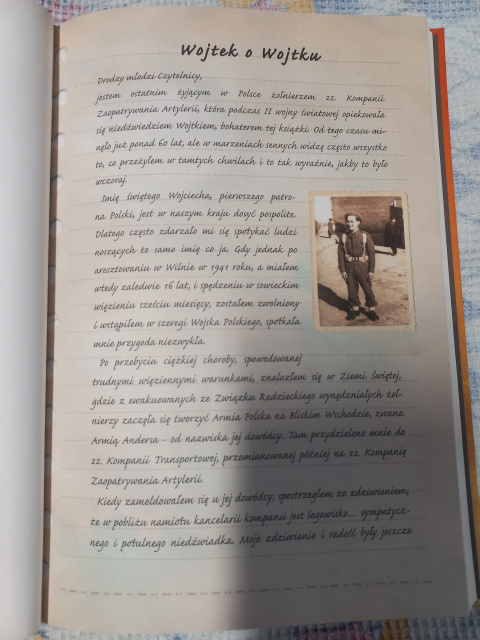 Książka autora Afryki Kazika, pod honorowym patronatem pani generałowej Ireny Anders, niezwykle ciekawie i zabawnie opowiada prawdziwą historię niedźwiedzia Wojtka czworonożnego przyjaciela żołnierzy z Armii Andersa, który przebył z nimi cały szlak bojowy przez Iran, Irak, Palestynę, Egipt do Włoch. Brał udział w bitwie pod Monte Cassino, pomagał nosić ciężkie skrzynie z amunicją, dzięki czemu został uwieczniony w oficjalnym emblemacie 22. Kompanii zaopatrywania Artylerii 2. Korpusu Armii Polskiej.Wspaniała, ciepła opowieść o niedźwiedziu-żołnierzu, niezapomniana lekcja historii, która brzmi jak bajkaaGorąco polecam do rodzinnego i szkolnego wspólnego czytania.