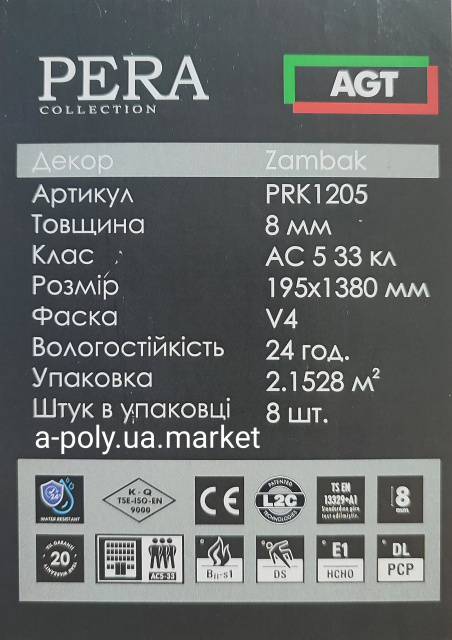 Ламінат вологостійкий AGT Pera Zambak PRK1205 товщина 8 мм 33 клас зносостійкості з фаскою V4, продаж кратно упаковкам.