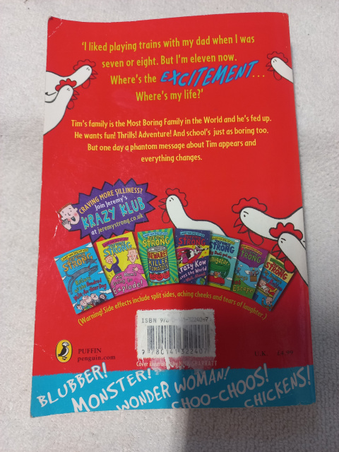 'I liked playing trains with my dad when I was seven or eight. But I'm eleven now. Where's the excitement . . . Where's my life?!'Tim's family is the Most Boring Family In The World and he's fed up. He wants fun! Thrills! Adventure! And school's just as boring too. But one day a phantom message about Tim appears and everything changes. Who is the day-glo scribbler – and what's so special about chickens anyway?
