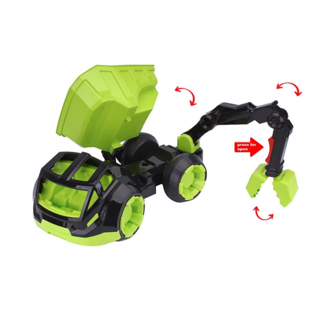 Уникальной особенностью самосвала является мощный манипулятор-погрузчик с двустворчатым ковшом,который пригодится при работе с сыпучими стройматериалами. Благодаря манипулятору загрузки песком или гравием происходят без помощи экскаваторов и других тракторов. Именно о такой машине мечтают многие строительные фирмы! Манипулятор вращается вокруг своей оси и движется вверх-вниз. Ковш открывается с помощью кнопки на корпусе. Благодаря пружине створки ковша крепко сжимаются и надежно удерживают песок. С манипулятором игры с самосвалом станут особенно интересными.