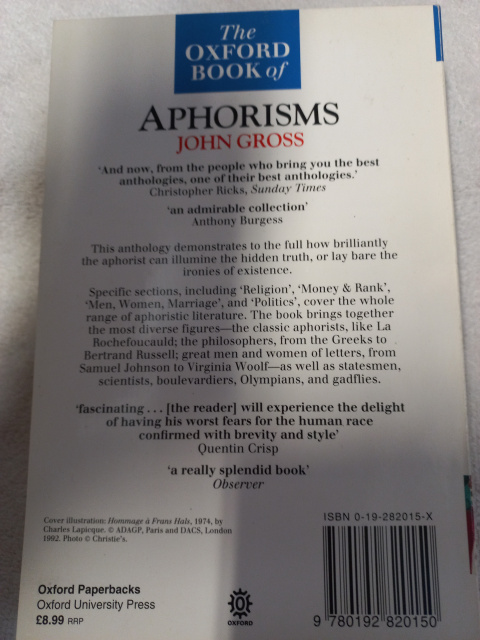 are the philosophers from the Greeks of Paul Valéry, the social commentators from Edmund Burke to Walter Benjamin. Statesmen and scientists, Olympians and gadflies, mystics and boulevardiers--this collection brings together the most diverse figures, drawing freely on ancients and moderns, on the widsom of East and West, juxtaposing viewpoints as different as those of Jean Cocteau and George Orwell, Ambrose Bierce and Marcus Aurelius, Lord Chesterfield and Elias Canetti. Profound, provocative, and vastly entertaining, The Oxford Book of Aphorisms will lure the reader back to its pages time and again. The book is fully indexed, and wherever possible, sources, dates, and complete names are supplied.