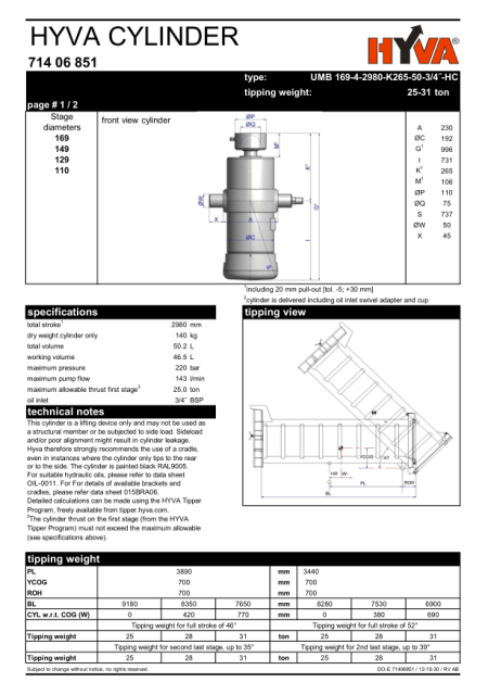 Цей циліндр є лише підйомним пристроєм і не може використовуватися як елемент конструкції або піддаватися бічному навантаженню. Бічні навантаження та/або погане вирівнювання можуть призвести до протікання балона. Тому Hyva рекомендує використовувати підставку, навіть у тих випадках, коли циліндр нахиляється тільки назад або вбік. Циліндр пофарбований у чорний колір RAL9005. Відповідні гідравлічні олії див. у специфікації OIL-0011. Детальнішу інформацію про доступні кронштейни та люльки див. у специфікації 015BRA07.Детальні розрахунки можна зробити за допомогою програми HYVA Tipper. Зусилля циліндра на першому ступені (за даними програми HYVA Tipper) не повинно перевищувати максимально допустиме (див. специфікації вище).