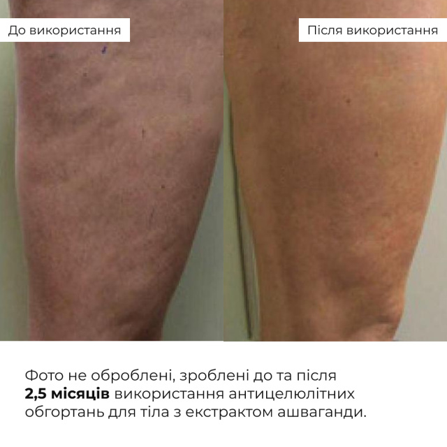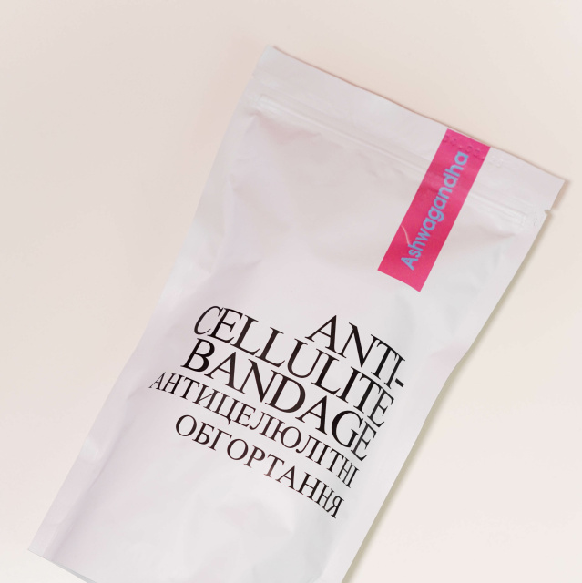 Антицелюлітні моделюючі обгортання для тіла з екстрактом ашваганди допомагають зменшити прояви целюліту та покращити текстуру шкіри, зміцнити її структуру та зробити тіло більш підтягнутим і гладким.
